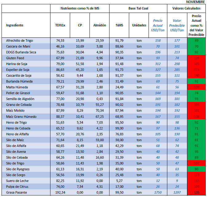 Valor Predecible; se calcula como el Promedio de todos los nutrientes y precios de los ingredientes que figuran en la lista.