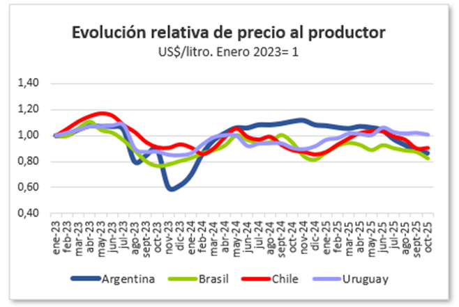 La evolución relativa de los precios locales en dólares muestra que entre la declinación de Brasil y Chile se destaca la caída del precio de leche al productor en Argentina, mientras Uruguay se mantiene.