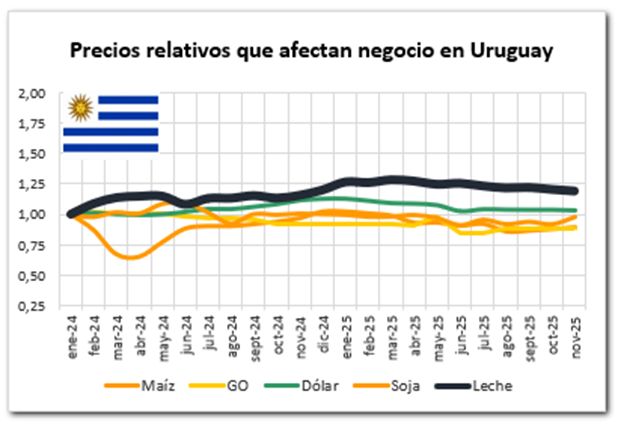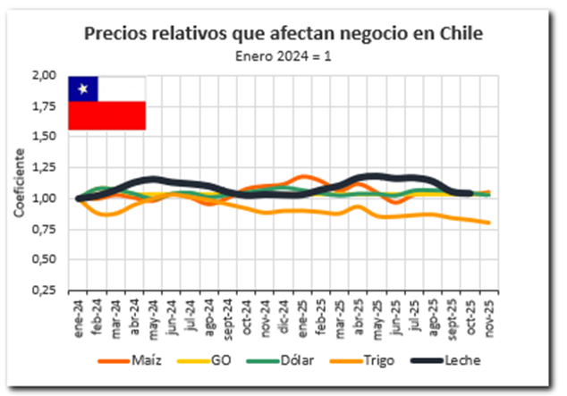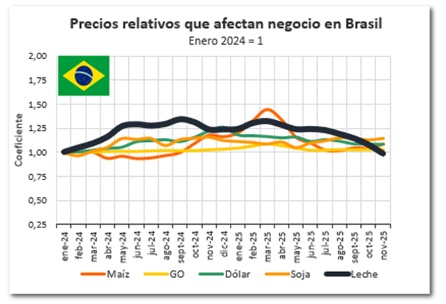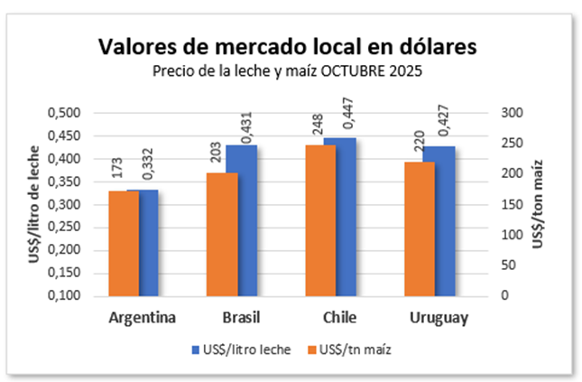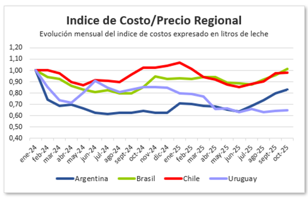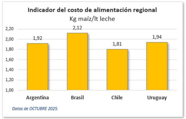 En lo que hace a los costos de alimentación, que mejoraron en todos los casos, el productor con la mejor relación Maíz/Leche en este momento es el brasilero con 2,12 kg maíz/litro de leche, seguido por el uruguayo con 1,94 kg/lt., el argentino sigue bajando a 1,92 kg/lt. y finalmente el chileno con 1,81 kg maíz/lt es la relación más baja en la región. Los cálculos corresponden a OCTUBRE 2025, mes que contamos los precios de leche al productor en todos los casos.