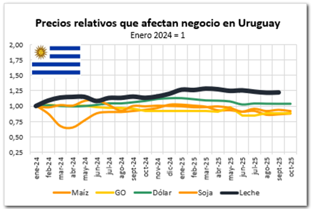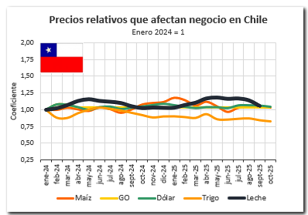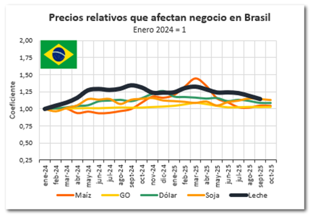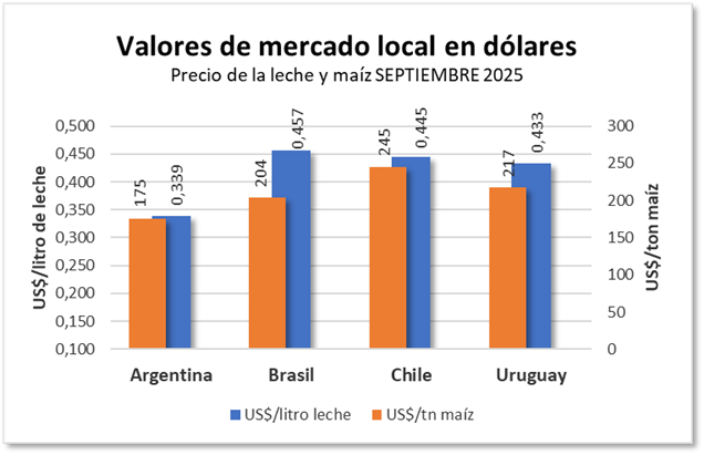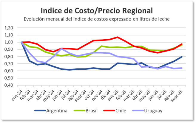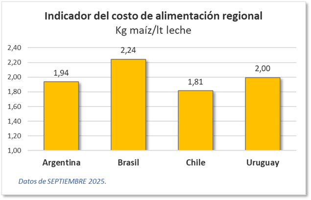 En lo que hace a los costos de alimentación, que mejoraron en todos los casos, el productor con la mejor relación Maíz/Leche en este momento es el brasilero con 2,24 kg maíz/litro de leche, seguido por el argentino con 1,94 kg/lt., el uruguayo se reacomodó con 2,00 kg/lt. y finalmente el chileno con 1,81 kg maíz/lt es la relación más baja en la región. Los cálculos corresponden a SEPTIEMBRE 2025, mes que contamos los precios de leche al productor en todos los casos.