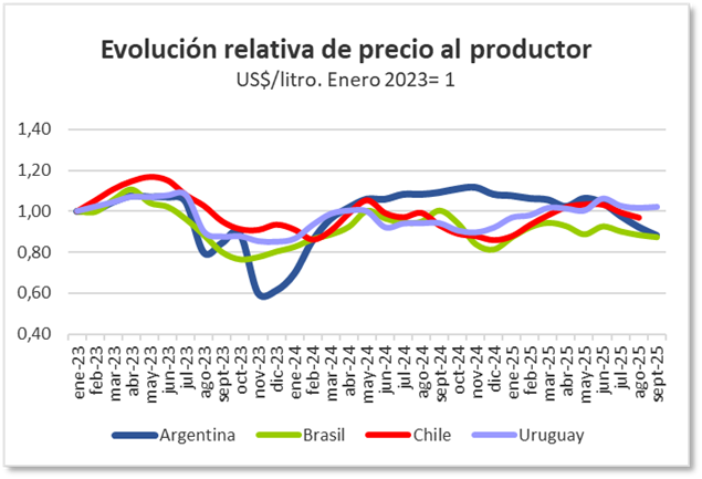 La evolución relativa de los precios locales en dólares muestra que entre la declinación de Brasil y Chile se destaca la caída del precio de leche al productor en Argentina, mientras Uruguay se mantiene.
